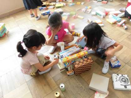 図画工作科で,いろいろな箱を並べたり,積んだりして楽しむ学習をしました。「お城を作りたい!」「ピタゴラスイッチみたいなものを作れるかなあ。」と,わくわくしながら作品を作っていきました。作った後には,友達の工夫したところを認め合う,素敵な姿が見られました。