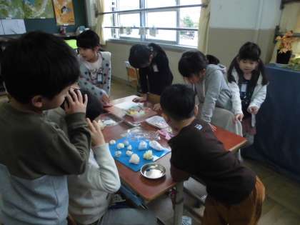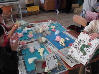 先週の図画工作科の時間に紙粘土を使って,ごちそうを作りました。まずは,紙粘土に絵の具を混ぜて,ネリネリ……。その感触を十分楽しんでから,思い思いのごちそうを作りました。かわいいケーキやクッキーも詰めて,カラフルな作品が出来上がりました。