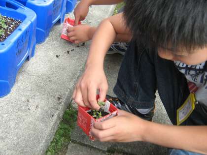 牛乳パックに土を入れて,間引きした苗を持ち帰りました。
