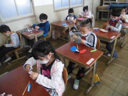 初めに,ハサミの正しい使い方やハサミの使うときの約束事を学びました。その後,紙を折って,模様を切り抜いたり,手をつないだ人型になるように考えて切ってみたりしました。切り抜いた後,折り紙を広げるときには,どんな模様ができているのかわくわくしていました。