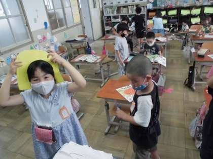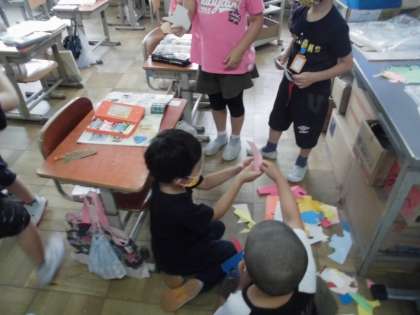 図画工作科「いろいろなかたちのかみから」では,様々な形の紙を用意しました。いろいろな方向から紙を見て,何に見えるかを考えました。「あ!!先生,これゾウに見える!」「わ,これ恐竜かなあ。」「先生!これ髪みたいや!」「これはチョウに見える。」などみんなのイマジネーションが広がって,たくさんの紙に命が吹き込まれました。今日は,その紙を使って画用紙に絵を描きました。「7つ,エリアがあるねんで。」と説明してくれたり,「先生,ここになんか足したい。」とさらにパスで描き足したり,とても素晴らしい作品が出来上がってきました。学習の最後にはみんなで絵を鑑賞しようと思います。