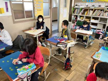 「どんなものにのって どんなところに行きたいかな?」そんな質問から学習が始まり,説明をすると,子ども達の目がキラキラしてきました。「私,雲にのって,空をお散歩したいな。」「ぼくは,ドラゴンに乗って,宇宙に行く!」「ぼくは虹に乗って,虹の群れのところにいきたいなあ。」「私はね…。」想像の世界が広がる広がる…。とてもかわいい世界がたくさん描かれていきました。「先生!2枚目はね,牛乳パックに乗って食べ物の世界に行くねん!こっちが,にんじん人で,こっちがキャベツ人やで!」「先生,これはな,星のお姉さんで,こっちがお兄さんやで。」とたくさんお話してくれました。次にみんなで鑑賞します。もうすぐ作品を全て持ち帰ります。ぜひ,素晴らしい画伯たちに,作品の説明をしてもらってください。