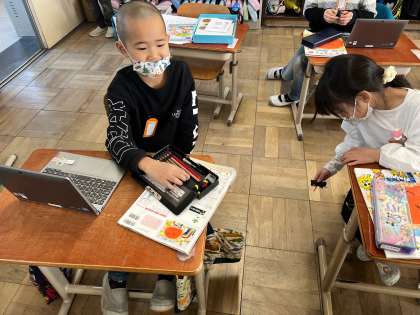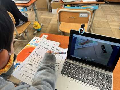 学校にはどんな隙間があるのでしょうか。1人ひとり自分だけのすきまちゃん人形を作って,すきまちゃんが好きな隙間を探しました。普段は何気なく見ている風景も,よく見てみると様々な隙間があることがわかりました。GIGA端末を使って,すきまちゃんを記念撮影して,ロイロノートにアップし,みんなですきまちゃんの写真を見合いました。「うわ!〇〇さんの見つけた隙間,すごいなあ。」「ここ,どこやろ。おもしろいなあ。」と友だちの見つけた隙間の面白さをたくさん見つけることができました。すきまちゃんは持って帰っていいよ,と伝えるとかわいい相棒ができたようで,大切に持ち帰っていました。