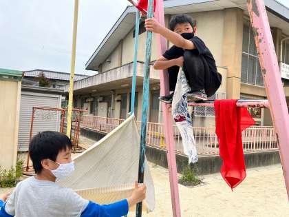 1組は月曜日,2組は本日水曜日に「ぬのをつないで」の学習をしました。とても身近な素材である布。様々な形に折ったり切ったりして形を変えることができる布ですが,今回は,布同士や布とものをつないでいくことを楽しみました。『形や色を工夫しながら布をつないでいこう』というめあてを達成できるように,どんどんつないでいきました。高いところからつないだり,鉄棒と木をつないで,テントみたいにしたり,のぼり棒とうんていをつないで旗みたいにしたりと,どんどんアイデアが膨らみました。