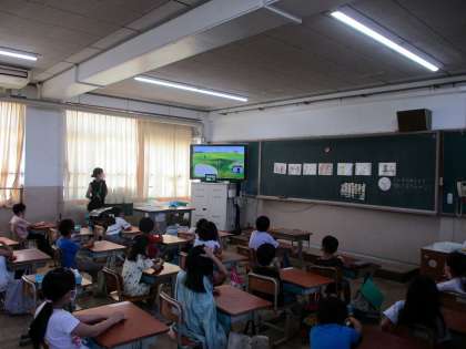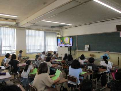 今日の1時間目は、オンラインで各教室をつないで「9月の朝会」を行いました。