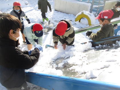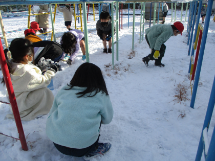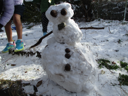 校庭が一面まっ白になりました。子どもたちと雪遊びをしました。伏見では珍しい雪に子どもたちは大はしゃぎでした。手が真っ赤になりながら,思いっきり雪の感触や冷たさを感じました。2年生オリジナルのオラフも作りました。