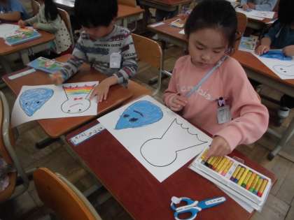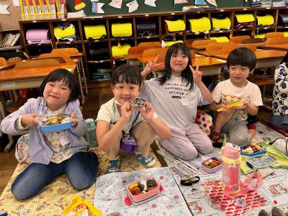 楽しみにしていた校外学習が、雨で延期になってしまいましたが、元気いっぱい今日も学習に取り組みました。体育館で「もうじゅうがり」や「進化じゃんけん」をしたり、可愛い雨つぶとてるてる坊主を作ったり、丁寧にひらがなを書いたりしました。お昼ご飯は、色とりどりのお弁当。みんなとっても嬉しそうでした。朝早くからの準備、ありがとうございました。