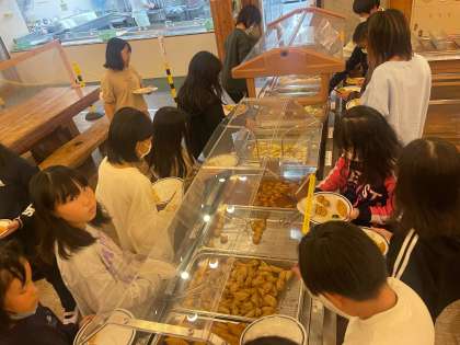 夕食の様子です。ご飯と味噌汁は全員に配り、後はバイキング形式になっています。みんなたくさん食べていました。たこ焼きが大人気です。