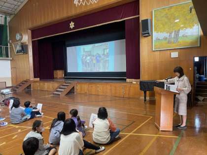 本日、6月の朝会がありました。まず、先日行われた「1年生を迎える会」について、全校で振り返りをしました。どの学年の発表も大変すばらしく、1年生は大喜びでした。これらも、仲良く助け合って学校生活を過ごしてほしいと思います。