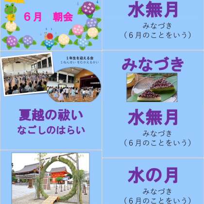 2つ目は、水無月についてです。6月の異名と同じ名前の和菓子「みなづき」について、たくさんの子どもが知っていました。さすが京都。この「みなづき」を食べるならわしについて、夏越の祓いや氷室などの歴史的背景に触れながら、お話しました。
