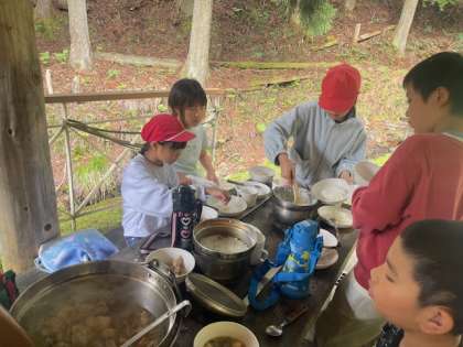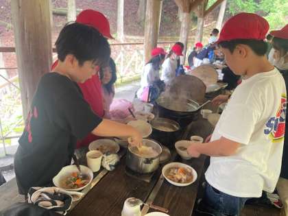 ?3日目のメインイベント「野外炊事」。グループで協力をして、「すき焼き風煮」を作りました。グループで役割分担をして、責任をもって仕事に取り組むことができました。みんなで協力をして、大自然の中で作った料理は心まであたためてくれました。味も格別でした。「ごちそうさま」をした後も、「感謝」の通りピカピカに後片付けをしてくれていました。次にこの道具を使う人たちのことを考え行動していたのも大変素晴らしいです。