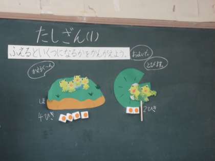 まだまだ習いたての「たしざん」を,カエルさんのお話を考えながら,数図ブロックの動かし方を工夫して,みんなで楽しく学習することができました。