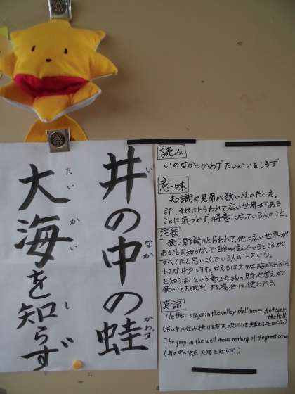 さて,今月のことわざは「井の中の蛙大海を知らず」です。意味は狭い見識にとらわれて,ほかに広い世界があることを知らないで,自分の住んでいるところがすべてだと思い込んでいることのたとえです。もうすぐ夏休みです。夏休みには今まで知らなかったことを広く知る体験をしてほしいという思いでこのことわざを選びました。井戸の中しか知らないカエルに広い海の話をしても通じないと荘子の言葉に基づいています。夏休みは広い見聞に接する良い機会です。今までにないたくさんのことを体験したり,経験したりして自分を磨いてほしいと思います。