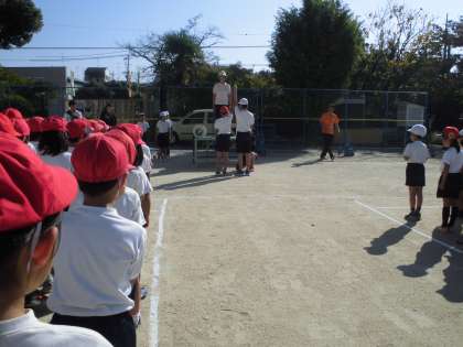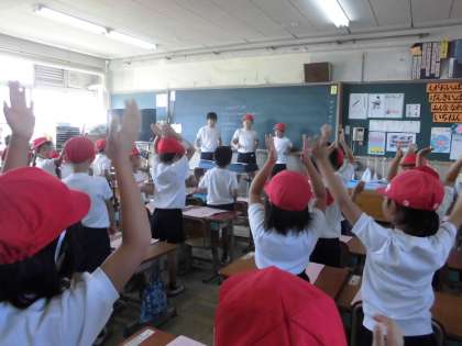 運動会での目標は,「お家の人やお客さんに一生懸命に頑張ってカッコいいところを見せる!」です。毎朝,応援団の5・6年生と取り組んでいる応援朝練習でも,みんな精一杯声を出しています。1年生のダンス「ドラゴンナイト」も,一つずつの動きがみんなとピッタリ合うように工夫して練習しています。