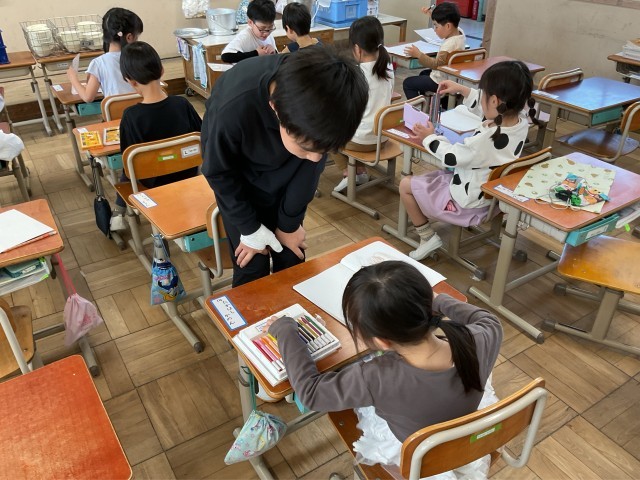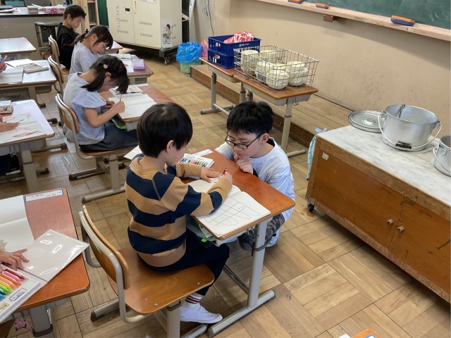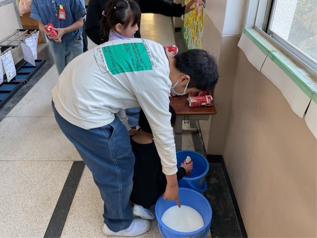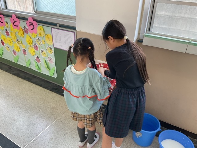 様子を見に行くと、牛乳パックの開け方に困っていた1年生に優しく教えてあげる素敵な6年生の姿がありました。