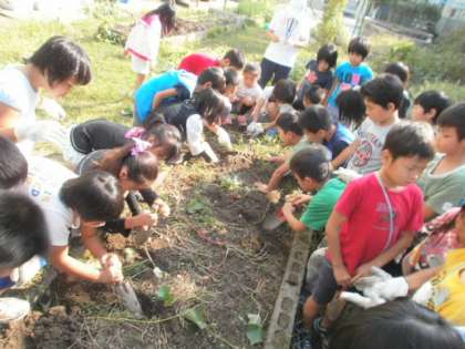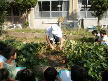 生活科のやさいをそだてようの学習で,学校のふれあい広場で,さつまいもを育てていました。毎日ふれあい広場に行って水やりをしていた子どももいます。