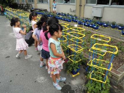 葉やツルもだいぶ大きくなり,ついにあさがおの花が