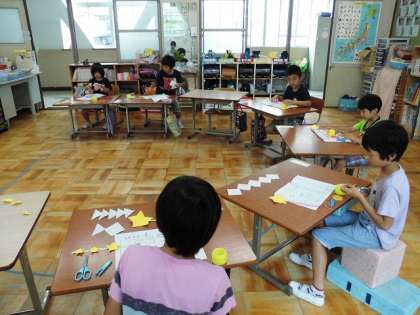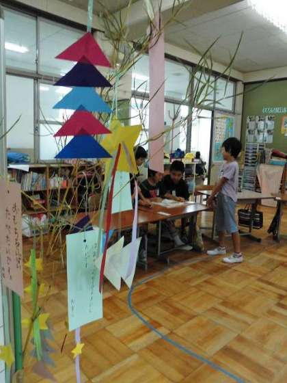 みんなで七夕の飾りをつくって,短冊に願い事を書きました。学校の笹に結びつけました。みんなの願いがかないますように・・・