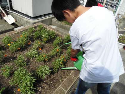 子どもたちが追肥や雑草を抜いたりして花壇の整備を