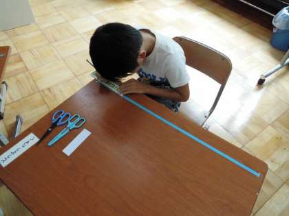 今年も10月に伏見西支部の育成学級の合同運動会を開催します。そのプログラムの中にマラソンがあり,折り返しリボンづくりを下鳥羽校が担当します。水色のリボンの長さを測って切り,輪ゴムに結びます。定規で測ったり,決まった長さの型紙で測ったりして線を入れ,ハサミで切りました。支部の育成学級のみんなが頑張れるように思いを込めて作りたいです。