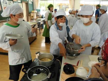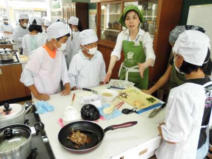 家庭科の学習で大阪ガスの方に来ていただき,ごはん・お味噌汁を作りました。ご飯は,炊飯器を使わずガスで炊きます。お味噌汁は鰹節で本格的に出汁をとり,出汁に使った鰹節は捨てずに,炒めてふりかけに!!どれも美味しく仕上がりました。ぜひ,子ども達にお家でも,作ってもらってはいかがでしょうか。