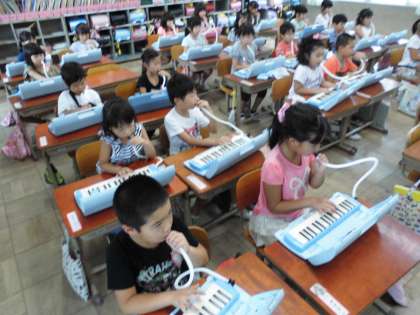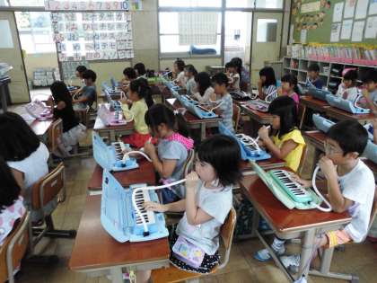 けんばんハーモニカを学習する日。けんばんハーモニカの国から1年生のみんなに手紙が届きました。「けんばんハーモニカめいじん」になるひみつを教えてもらいました。けんばんハーモニカのくにまで,すてきな音がとどくように,これから練習をがんばっていきましょう。