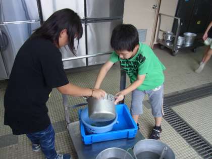 給食委員会では,みんながきれいに食管や牛乳パックを片づけられるように,給食の後片づけのサポートをしています。