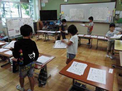 各教室で掲示する給食カレンダーの印刷や帳合,台紙取付など,ひまわり学級での作業学習として毎月取り組んでいます。みんな順番を守り,一枚ずつ取って重ね,集中して取組んでいました。