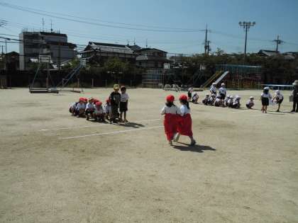 二人の息を合わせて,チームでバトン…いや「デカパン」を