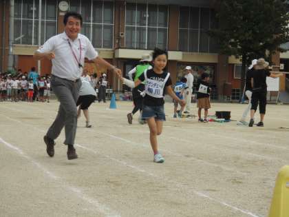 「借り物競争」では,井上校長先生も子どもたちと楽しそうに走っておられる姿がありました。