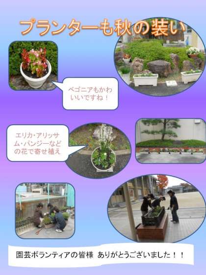 11月8日(月)園芸ボランティアの三上さん・藤井さん・横水さんの3人が,正門前のプランターなどに、エリカ・アリッサム・ベゴニア・パンジー・アイビーなどの花で寄せ植えをしてくださいました。また、プール南の花壇や運動場の花壇にもクフェアなどの花を植えてくださいました。これからの季節を彩る花々が植えられたプランターで校庭が一段ときれいになりました。ありがとうございました。