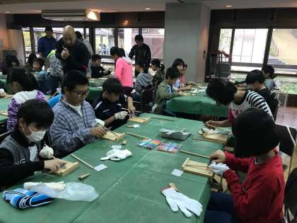 竹をナイフで削ってお箸をつくります。竹は硬いところがあって苦戦した人もいたようです。先を丁寧に細く削ってヤスリで磨いて完成です。