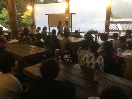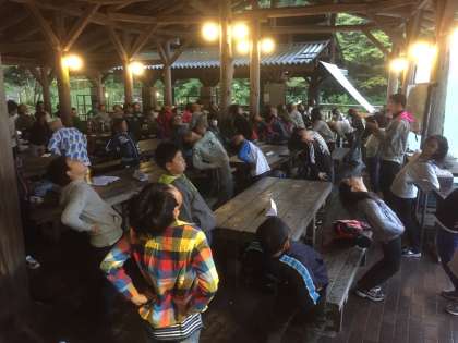 朝の集いでは,リーダーを中心に今日のめあてやスケジュールの確認・ラジオ体操をして体を起こしました!!自然の中でのラジオ体操もなかなかいいものですね!!