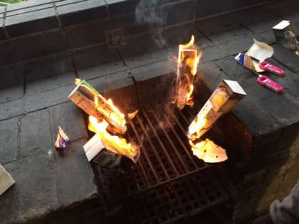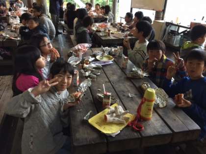 パンにウインナー・カレー味のキャベツをはさみ,アルミホイルで包んで,それを紙パックに入れて火をつけ焼く!!すると…なんということでしょう!!