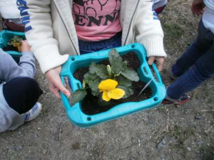 2年 パンジーを植えたよ。