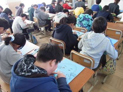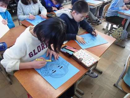 図工の学習では,自画像の版画に挑戦しています。自分自身の特徴をしっかりと捉え,彫る向きを工夫して顔の表情をだすなど,作品の完成が今からとても楽しみです。