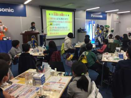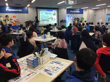 パナソニック電池工場に到着し,早速,係の方の注意を聞きながら「電池作り」をしているようです!!みんな,細かい作業も頑張って!!