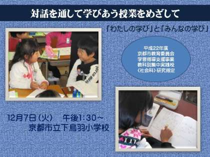 多くの皆様に参観して頂き,今の下鳥羽小学校の授業において,「足らないものや欠けているものは何か。」という点を厳しくご指導頂けたらと思っています。現場の先生方はもちろん,保護者や地域の方もどうぞご参加ください。