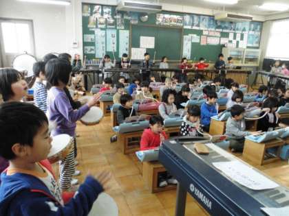 1年生58名で楽器をつかってみんなで演奏しました。いろいろな音が重なってすてきな音楽になりました。みんなで音を合わせる楽しさを味わいました。