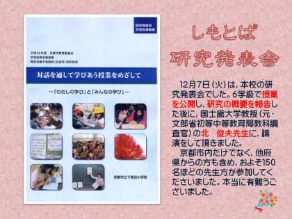 本日の授業を参観して頂き,下鳥羽小学校の,今の授業に「足らないもの」「欠けているもの」をどうぞご指摘ください。私たちは,皆様から厳しいご意見を頂き,多くのことを学ぶ機会にしたいと思っています。