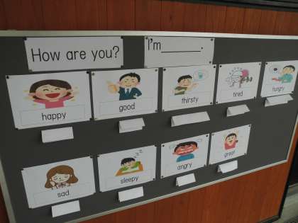 体育館の壁面掲示には,「How are you?」など,気分や体の調子をたずねたり,答えたりする例文があります!