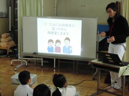 2年生は,測定前に中澤先生に怪我をした時のことを教えてもらっていました。