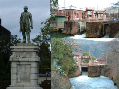 琵琶湖疏水記念館を出て,疏水沿いに歩いていきます。京都会館の横を通って鴨川に向かって歩いて行くと,夷川発電所・ダムが見えてきます。ここには,先ほどの田辺朔郎博士とともに琵琶湖疏水建設に貢献した第3代京都府知事、北垣國道の像もあります。田辺朔郎博士の像は近くで見れましたが,北垣國道の像は疏水の向こう側です。