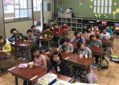 フッ化物洗口が始まっています。1年生は,水でうがいの練習です。