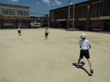 はじめは,特殊な形のボールに慣れて,投げる・受ける練習をしたり,「タグ」をとって守ったりする練習をしました☆
