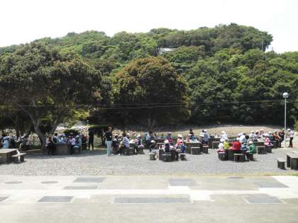 海をバックに「いっただっきまーす!」