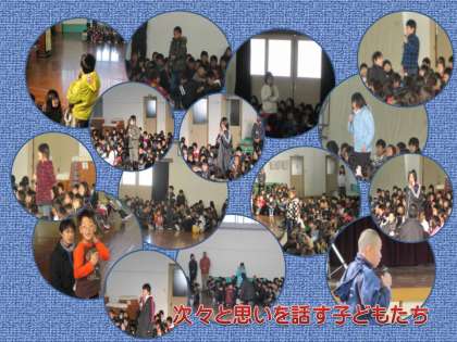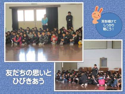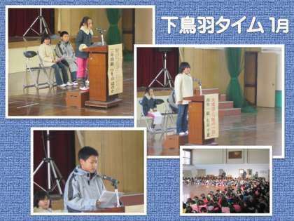 1月の「下鳥羽タイム」が行われました。校内の感動体験発表会である「下鳥羽タイム」も,子どもたちの心にしっかりと位置づいてきたように思います。代表の子どもが,毎日のくらしの中にある感動体験をじっくりと丁寧に語ります。これを聴いた子どもたちからは,ひびきあう心,自分の思いや考えが話されます。こうした積み重ねが大切です。