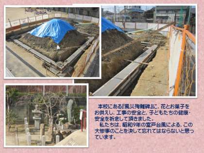 横にある『風災殉難碑』にお供えをしてくださいました。工事の安全無事な進行と,下鳥羽の子どもたちの健康・安全を祈念しています。
