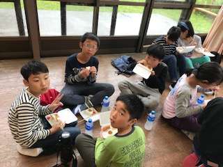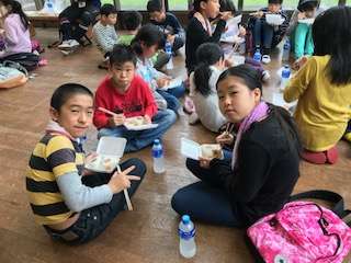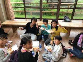 ハイキングの後はミーティングルームでお弁当を食べました。