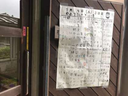 宿泊棟の入り口には、生活・保健係の人たちが作ってくれた日程表があります!